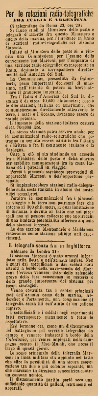 Note: Sono in corso studi al Ministero delle poste e telegrafi e della marina per realizzare in Italia una stazione di grande potenza in grado di trasmettere messaggi telegrafici con l’Argentina, l’Eritrea e la Sardegna; si pensa anche di dotare le nostre navi di stazioni radiotelegrafiche, con portata trasmissiva sino a 350 km - La marina militare inglese ha dotato le proprie navi con apparati telegrafici Marconi e sta addestrando il proprio personale per l’uso strategico del telegrafo senza fili